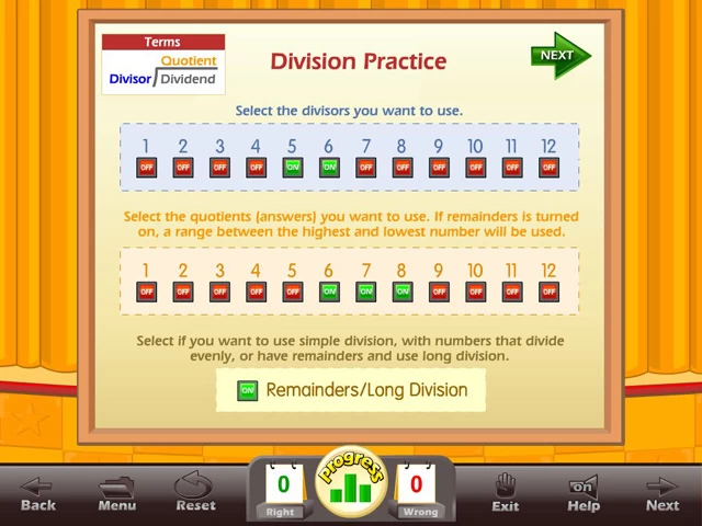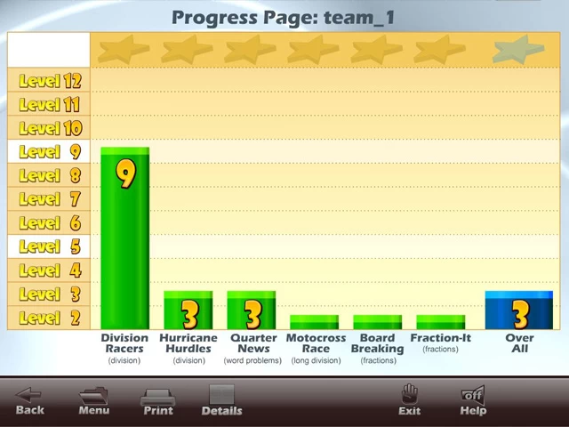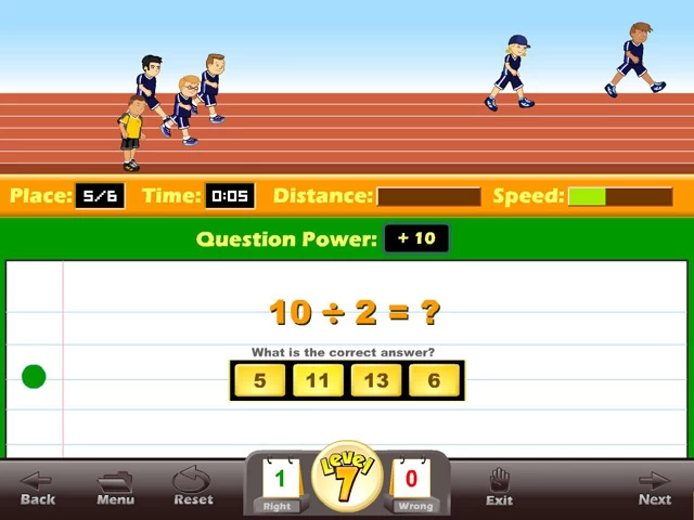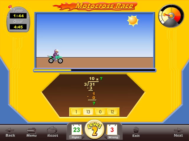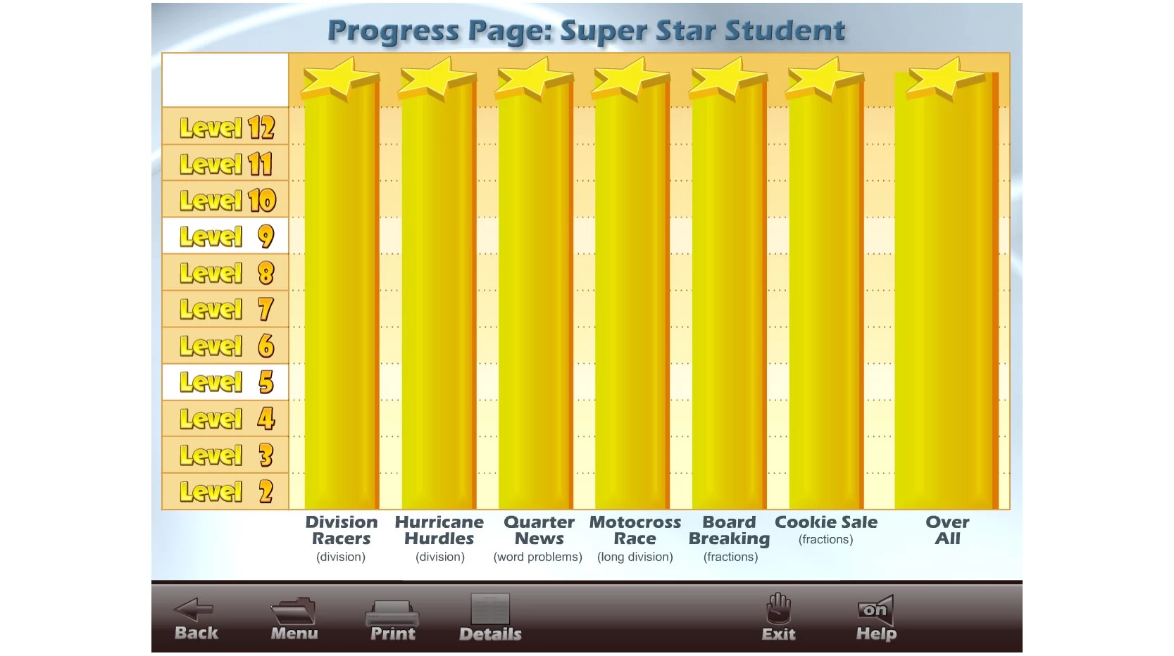Practicing division and fractions has never been so engaging and so much fun! Students begin at the appropriate level: beginning, intermediate or advanced. There are two practice sections to review specific division and fraction problems. Then the student builds math skills while playing challenging games such as car racing, hurdles, newspaper delivery, motocross, karate, and a game show. Each of these games features 11 levels of play. Complete each level to earn the gold star certificate!