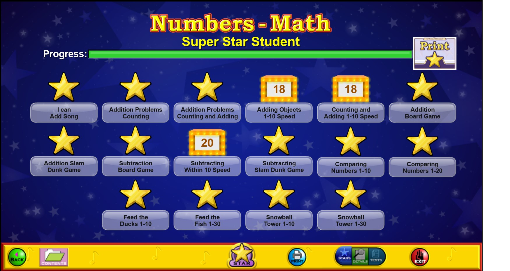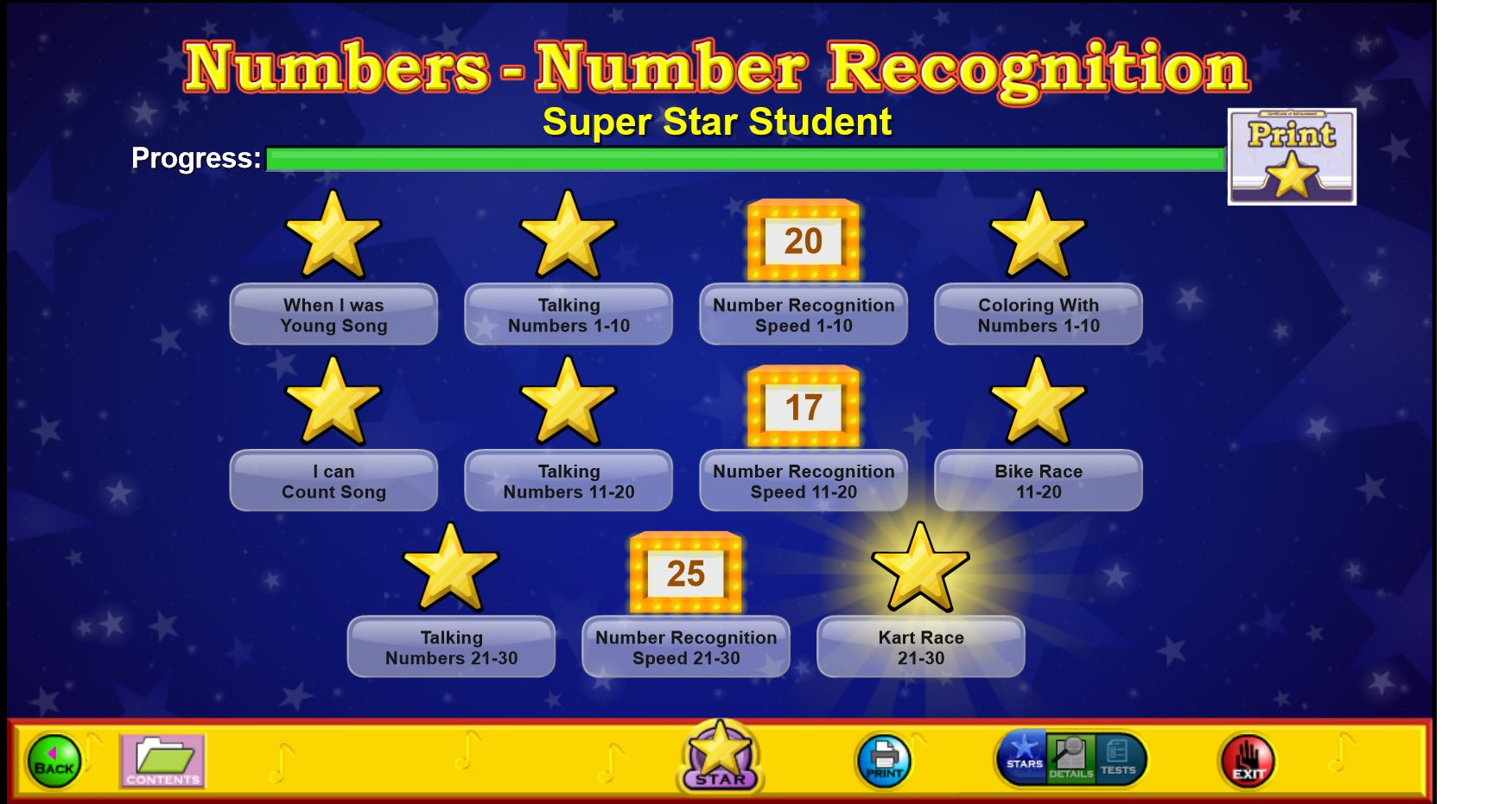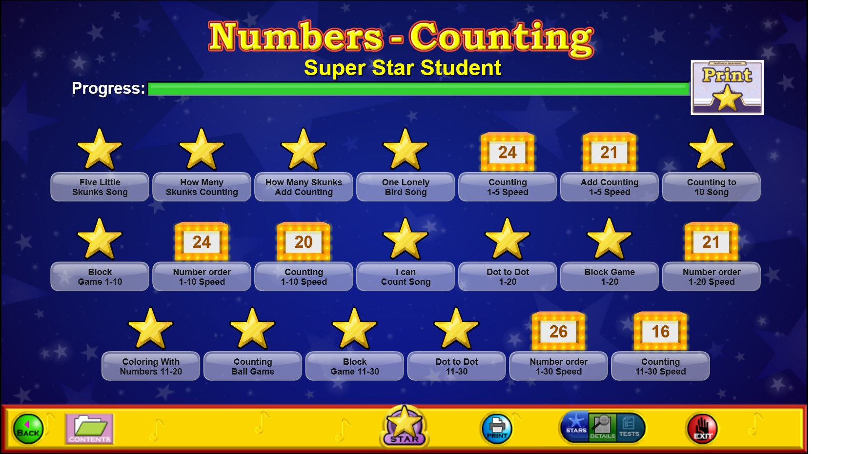 The following features are common to our numbers mini courses:- The Super Star Motivational and Data Tracking system, encourages students to earn silver and gold stars by completing each song, activity, or game